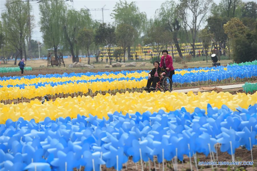 Turistas observan rehiletes de colores durante el Festival Internacional de Rehiletes, en Luoyang, en la provincia de Henan, en el centro de China, el 4 de abril de 2016. Un total de 500,000 rehiletes coloridos fueron colocados en distintas formas en el festival. (Xinhua/Li Bo)