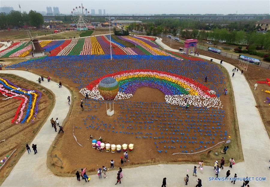 Turistas observan rehiletes de colores durante el Festival Internacional de Rehiletes, en Luoyang, en la provincia de Henan, en el centro de China, el 4 de abril de 2016. Un total de 500,000 rehiletes coloridos fueron colocados en distintas formas en el festival. (Xinhua/Li Bo)