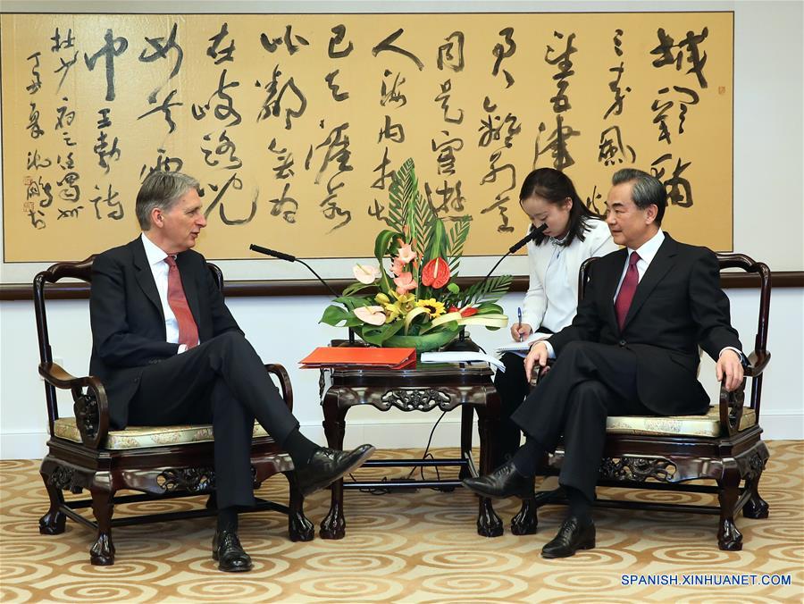 BEIJING, 9 abr (Xinhua) -- El ministro de Relaciones Exteriores chino Wang Yi se reunió con el secretario del exterior británico de visita, Philip Hammond. (Xinhua/Pang Xinglei)