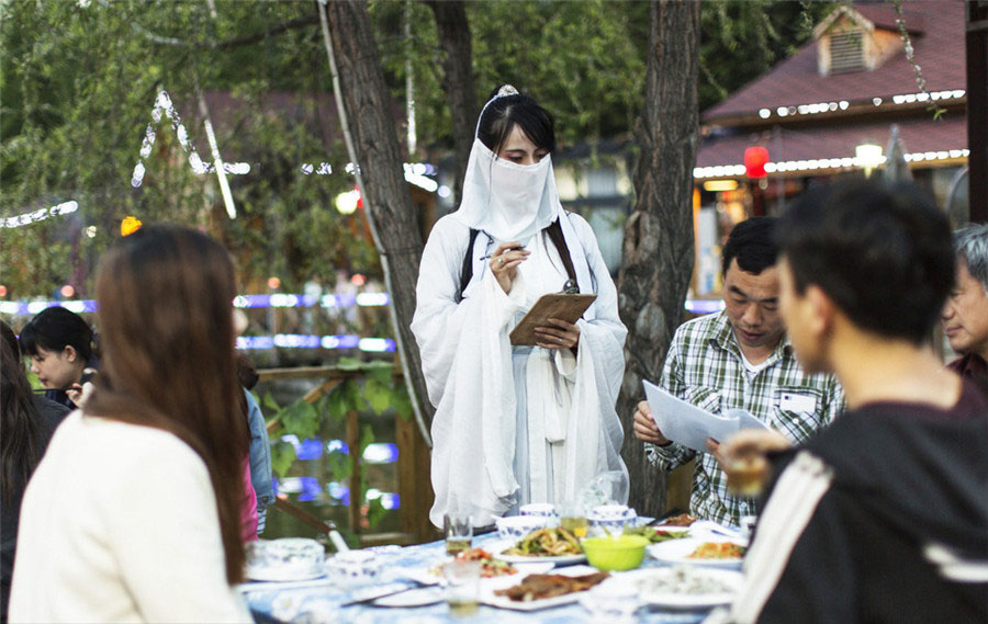 Una trabajadora recibe un pedido vestida con traje tradicional chino en un restaurante en la ciudad de Luoyang, provincia de Henan, el 9 de abril. Todos los empleados van vestidos con trajes tradicionales chinos. Su propietario espera promover la cultura tradicional china y ofrecer algo único en su establecimiento.