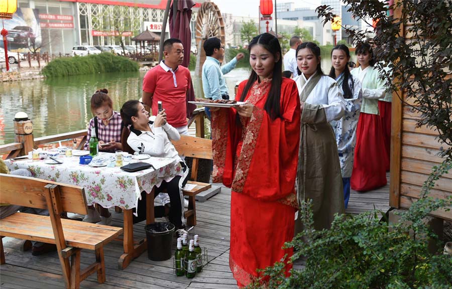 Trabajadores sirven platos vestidos con trajes tradicionales chinos en un restaurante en la ciudad de Luoyang, provincia de Henan, el 9 de abril. Todos los empleados van vestidos con trajes tradicionales chinos. Su propietario espera promover la cultura tradicional china y ofrecer algo único en su establecimiento.
