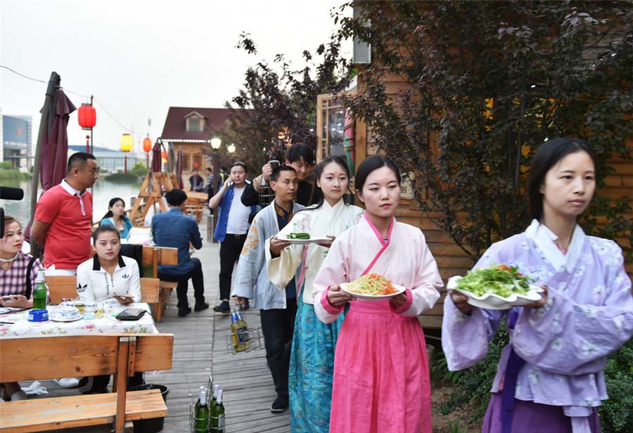 Trabajadores sirven platos vestidos con trajes tradicionales chinos en un restaurante en la ciudad de Luoyang, provincia de Henan, el 9 de abril. Todos los empleados van vestidos con trajes tradicionales chinos. Su propietario espera promover la cultura tradicional china y ofrecer algo único en su establecimiento.
