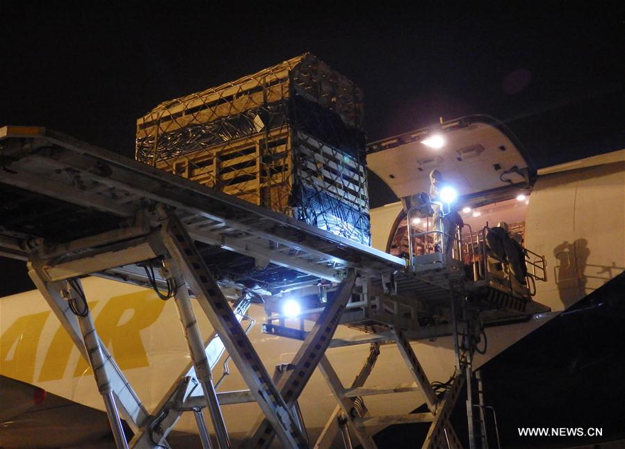 Zhengzhou,14/04/2016(El Pueblo en Línea)-Personal del aeropuerto descarga las jaulas donde se encuentran las alpacas, en el Aeropuerto Internacional Xinzheng de Zhengzhou, capital de la provincia de Henan, 13 de abril de 2016. Un total de 622 alpacas procedentes de Santiago de Chile llegaron a Zhengzhou después de 27 horas de vuelo. Permanecerán en cuarentena durante 30 días antes de llevarlas a sus destinos finales, donde el público podrá admirarlas. (Xinhua/Ma Yichong)