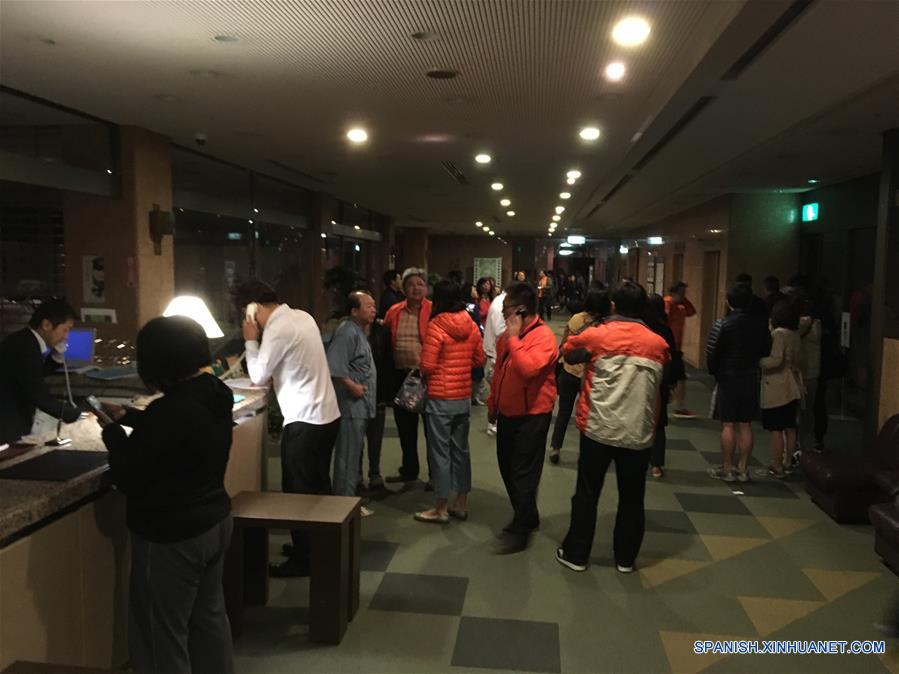 Personas se reúnen en el vestíbulo de un hotel después de un sismo en Kumamoto, en el suroeste de Japón, el 16 de abril de 2016. La prefectura de Kumamoto en el suroeste de Japón fue sacudida de nuevo el sábado por un sismo de magnitud 7.2 a las 01:25 hora local. El temblor generó una advertencia de tsunami que pronto fue suspendida. (Xinhua/Liu Tian)