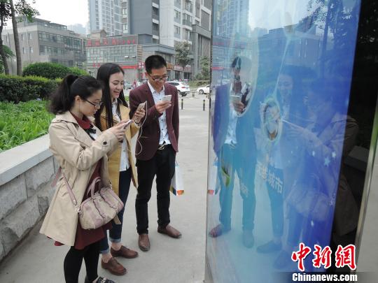 Los peatones disfrutan de vídeos gracias al Wifi gratuito que ofrece el cartel electrónico multifuncional. (CNS/Han Zhangyun)
