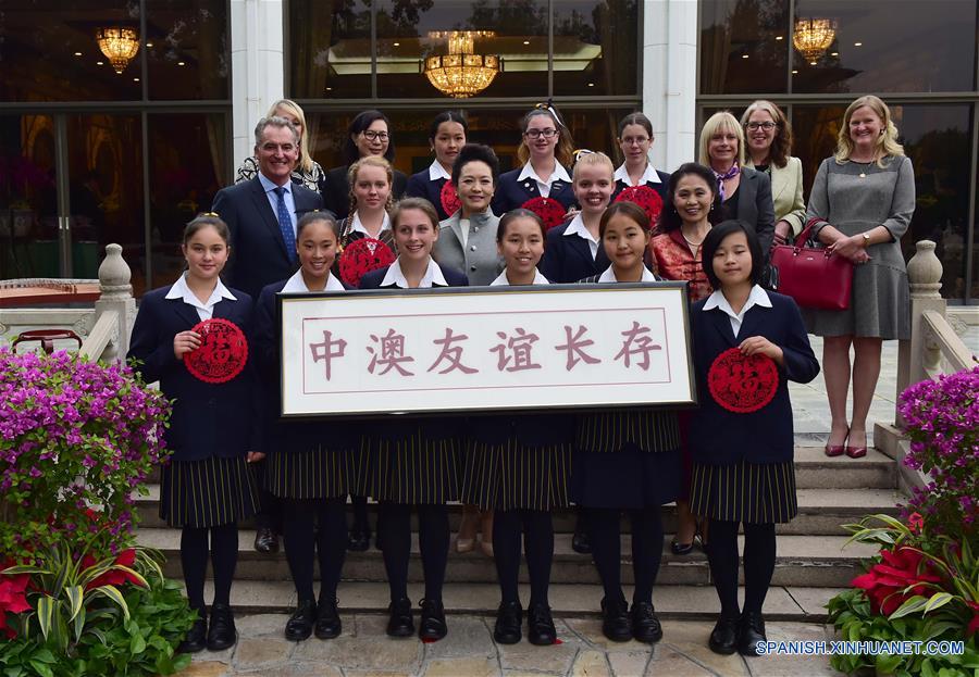 Peng Liyuan, la esposa del presidente chino Xi Jinping, se reúne con un grupo de estudiantes y maestros de Sydney, en Beijing, capital de China, 19 de abril de 2016. (Xinhua / Zhang Duo)