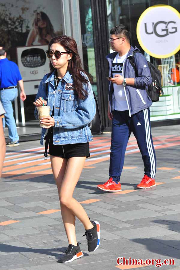 Una mujer con pantalones muy cortos pasea por las calles de Sanlitun en el distrito Chaoyang de Beijing, el 8 de abril de 2016.Los hombres y mujeres jóvenes de moda están impacientes por lucir sus estilos de verano a principios de primavera. [Foto por Guo Yiming / China.org.cn]