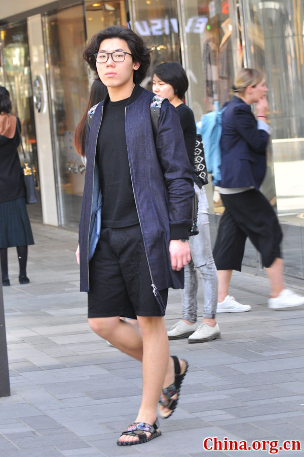 Un hombre con pantalones cortos y una chaqueta de primavera pasea por las calles de Sanlitun en el distrito Chaoyang de Beijing, el 8 de abril de 2016.Los hombres y mujeres jóvenes de moda están impacientes por lucir sus estilos de verano a principios de primavera. [Foto por Guo Yiming / China.org.cn]