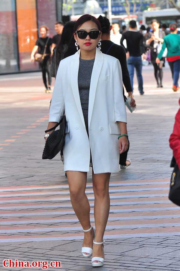 Una mujer camina por las calles de Sanlitun en el distrito Chaoyang de Beijing, el 8 de abril de 2016.Los hombres y mujeres jóvenes de moda están impacientes por lucir sus estilos de verano a principios de primavera. [Foto por Guo Yiming / China.org.cn]