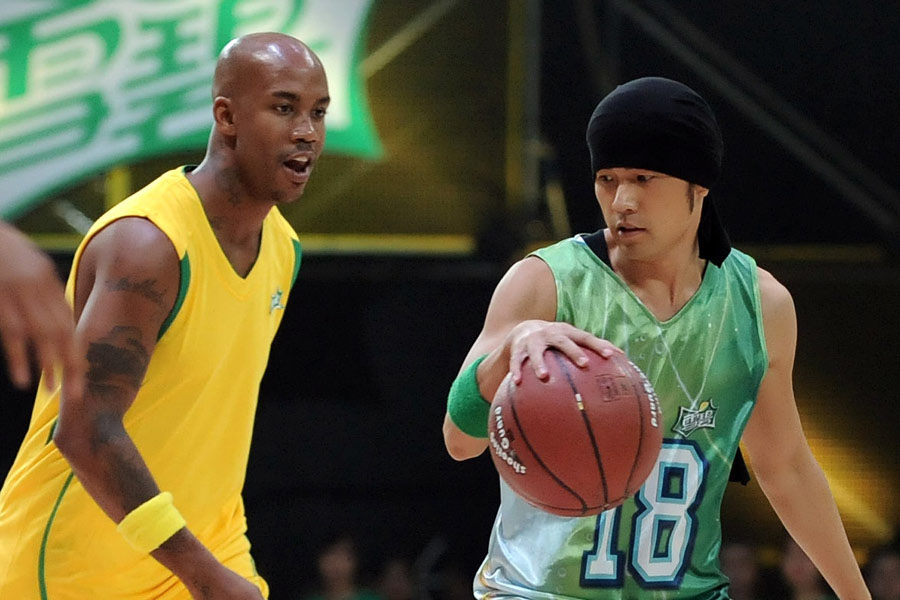 Marbury y el cantante Jay Chow (Zhou Jielun) en un partido de baloncesto benéfico en Shanghai, el 9 de agosto de 2013.