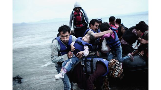 Un refugiado afgano carga a su hijo al llegar a la isla griega de Kos, luego de cruzar parte del mar Egeo entre Turquía y Grecia, en mayo de 2015