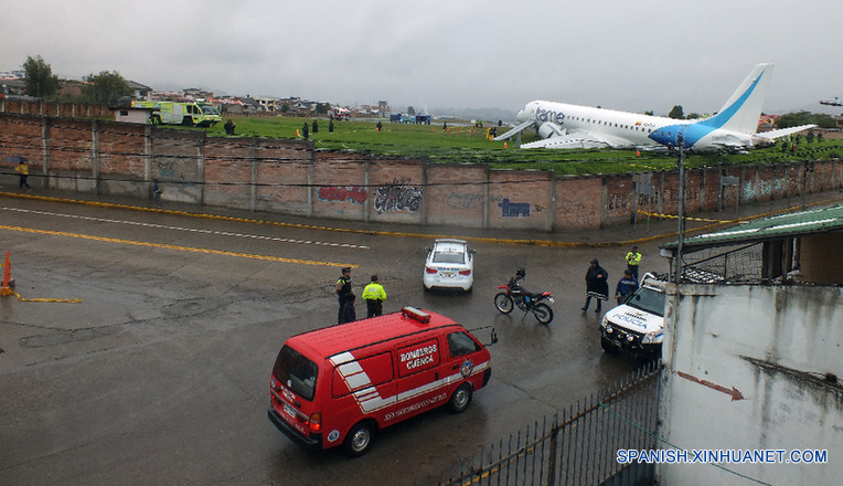 CUENCA, abril 28, 2016 (Xinhua) -- Elementos de seguridad permanecen cerca del avión Embraer 190 de la aerolínea pública ecuatoriana Tame que salió de la pista durante el aterrizaje, en el aeropuerto Mariscal Lamar, en Cuenca, Ecuador, el 28 de abril de 2016. El avión, que cubría la ruta Quito-Cuenca, perdió pista durante su aterrizaje el jueves en el aeropuerto Mariscal Lamar, de la ciudad andina de Cuenca (sur), sin dejar víctimas, informó la empresa en su cuenta de Twitter. Según la aerolínea, el percance se debió a la "malas condiciones meteorológicas reinantes", y agregó que los 87 pasajeros y seis tripulantes a bordo de la aeronave se encuentran "sin novedad" y fueron evacuados hacia la terminal aérea. (Xinhua/Str)