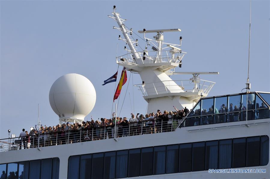 HABANA, 2 may (Xinhua) -- Turistas saludan en el crucero estadounidense Adonia al llegar a la ciudad de la Habana, la capital de Cuba, el pasado 2 de mayo. El crucero Adonia con 704 personas a bordo, entre ellos varios nacidos en Cuba arribó a la Habana el lunes tras zarpar desde un puerto de Miami la tarde del domingo. El último crucero de este tipo desde un puerto estadounidense rumbo a una destinación cubana tuvo lugar en 1978.