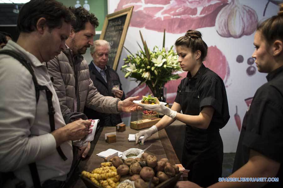 Una empleada sirve un sándwich de bondiola de cerdo durante la feria gastronómica Masticar 2016, en la ciudad de Buenos Aires, Argentina, el 5 de mayo de 2016. De acuerdo con información de la prensa local, la feria, organizada por la Asociación de Cocineros y Empresarios Ligados a la Gastronomía Argentina (ACELGA) y visitada por más de 100,000 personas, ofrece productos, menús económicos, charlas y cursos de renombrados chefs. (Xinhua/Martín Zabala)