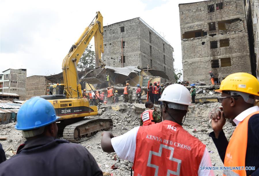 Una mujer fue encontrada hoy con vida bajo los escombros de un edificio residencial derrumbado hace seis días en Nairobi, la capital de Kenia.(Xinhua/Li Baishun)