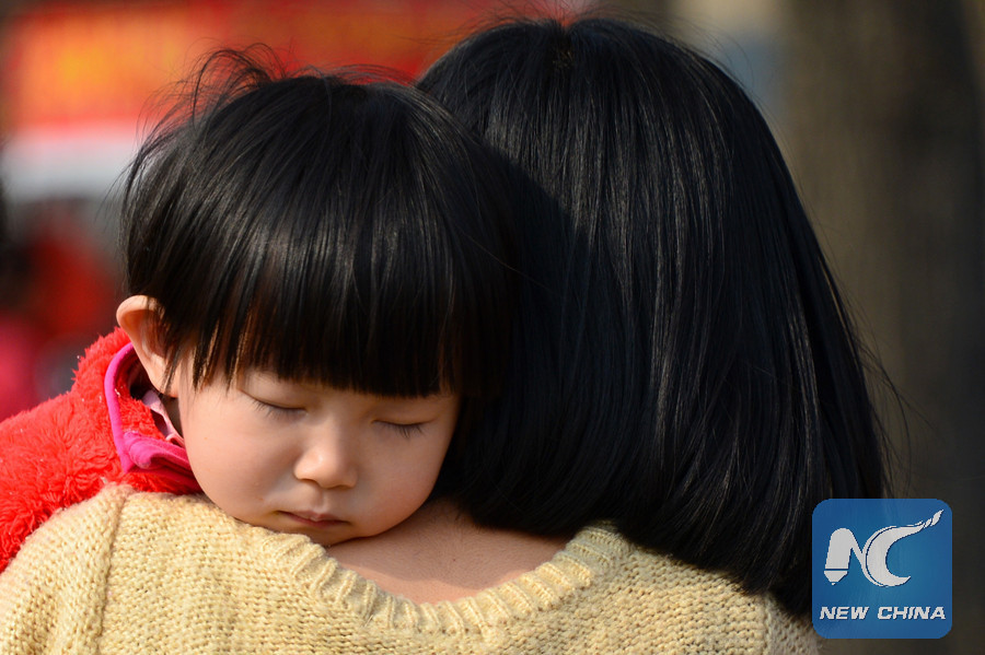 Un ni?o duerme en el hombro de una mujer en Jinan, capital de la provincia china oriental de Shandong, 16 de marzo de 2015. El 21 de marzo se celebró el 15o Día Mundial del Sue?o. (Xinhua/Guo Xulei)