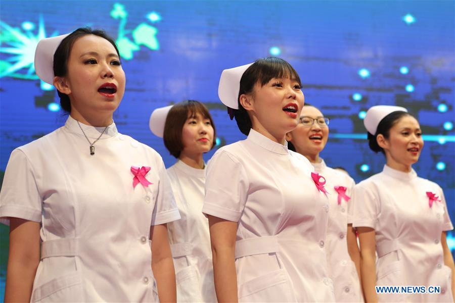 Beijing, 12 de mayo de 2016 (Xinhua)--Enfermeras cantan en una ceremonia celebrada el Día Internacional de los Enfermeros en el Hospital Universitario de la Unión Médica de Beijing, el 12 de mayo de 2016. (Xinhua/Zhang Yuwei)