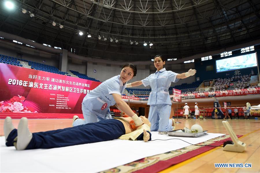 Chongqing, 12 de mayo de 2016 (Xinhua)--Una enfermera asiste a una competición de habilidades de enfermería en el condado Dianjiang de Chongqing, el 12 de mayo de 2016, jornada en la que se celebra el Día Internacional de los Enfermeros. (Xinhua/Tang Yi)