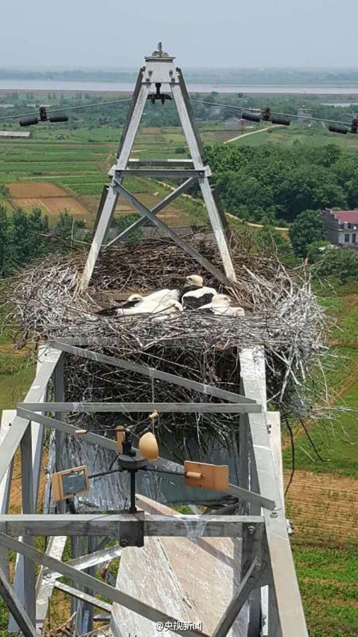 Un trabajador de la compa?ía eléctrica estatal State Grid fotografía un nido de cigüe?a blanca oriental sobre una torre de transmisión de electricidad, que mide 35,7 metros de altura, en la provincia de Jiangxi, el 17 de mayo de 2016. La cigüe?a blanca oriental es una especie en peligro de extinción. Teniendo en cuenta el informe meteorológico sobre una tormenta que se avecina en los próximos días, el trabajador se subió a la torre para reforzar el nido. El trabajador dijo que el nido no afecta a la transmisión de electricidad, pero necesitan consejos de expertos sobre cómo proteger mejor estas aves que anidan en las torres de electricidad. [Foto: weibo.com]