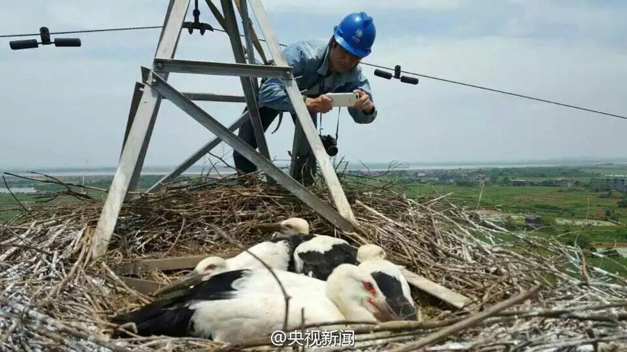 Nanchang,19/05/2016 (El Pueblo en Línea) -Un trabajador de la compa?ía eléctrica estatal State Grid fotografía un nido de cigüe?a blanca oriental sobre una torre de transmisión de electricidad, que mide 35,7 metros de altura, en la provincia de Jiangxi, el 17 de mayo de 2016. La cigüe?a blanca oriental es una especie en peligro de extinción. Teniendo en cuenta el informe meteorológico sobre una tormenta que se avecina en los próximos días, el trabajador se subió a la torre para reforzar el nido. El trabajador dijo que el nido no afecta a la transmisión de electricidad, pero necesitan consejos de expertos sobre cómo proteger mejor estas aves que anidan en las torres de electricidad. [Foto: weibo.com]