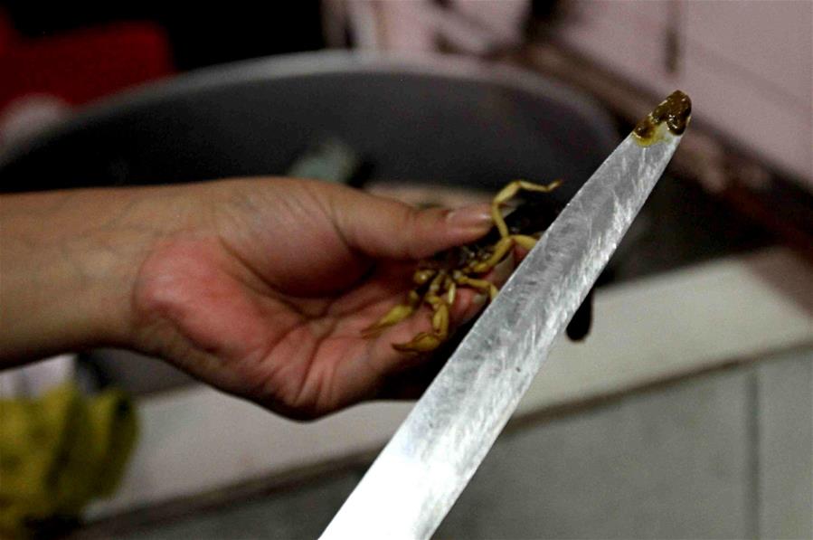 Una persona corta un alacrán para servirlo en un taco, en Durango, México, el 23 de mayo de 2016. De acuerdo con información de la prensa local, el taco de alacrán, preparado a base de este animal que abunda en la región y que es de los más venenosos, se ha vuelto desde hace unos seis meses uno de los preferidos de los visitantes, aunque no tanto con los lugare?os, gracias a su textura crujiente y a su sabor parecido al de las papas fritas. (Xinhua/Str)