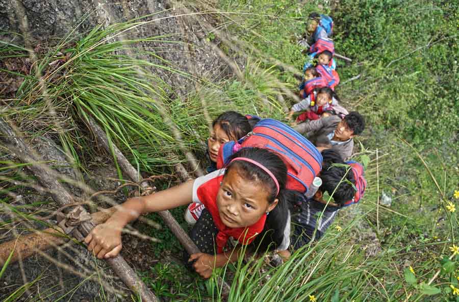 Los ni?os escalan un acantilado con una escalera rudimentaria hacia un pueblo aislado en la cima de una monta?a, el 14 de mayo de 2016. Los ni?os viven en el colegio y sólo regresan a casa dos veces al mes.