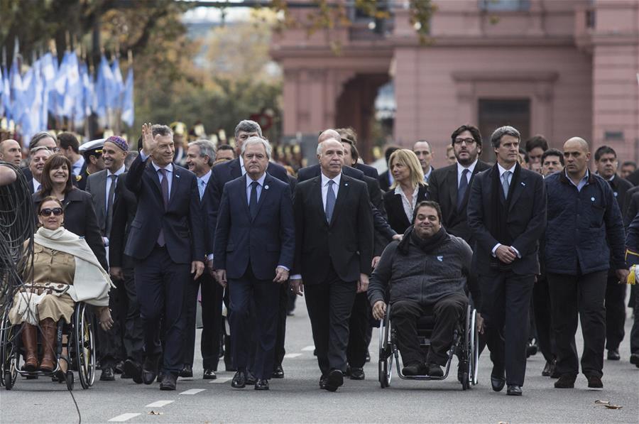 El presidente de Argentina, Mauricio Macri (2-i-frente), camina junto a la vicepresidenta Gabriela Michetti (i-frente) y miembros del gabinete de ministros luego de asistir al Tedéum en el marco de las celebraciones por la "Revolución de Mayo" en la Plaza de Mayo frente a la Catedral Metropolitana, en Buenos Aires, capital de Argentina, el 25 de mayo de 2016. El presidente de Argentina, Mauricio Macri, asistió el miércoles a una celebración religiosa en la Catedral de Buenos Aires, en el marco de las celebraciones por el 206 aniversario del primer gobierno patrio del país sudamericano. (Xinhua/Martín Zabala)