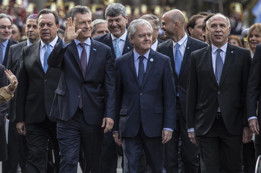 El presidente de Argentina, Mauricio Macri (i-frente), camina junto al presidente provisional del senado, Federico Pinedo (c-frente) y al presidente de la Corte Suprema de Justicia, Ricardo Lorenzetti (d-frente), luego de asistir al Tedéum en el marco de las celebraciones por la "Revolución de Mayo" en la Plaza de Mayo frente a la Catedral Metropolitana, en Buenos Aires, capital de Argentina, el 25 de mayo de 2016. El presidente de Argentina, Mauricio Macri, asistió el miércoles a una celebración religiosa en la Catedral de Buenos Aires, en el marco de las celebraciones por el 206 aniversario del primer gobierno patrio del país sudamericano. (Xinhua/Martín Zabala)