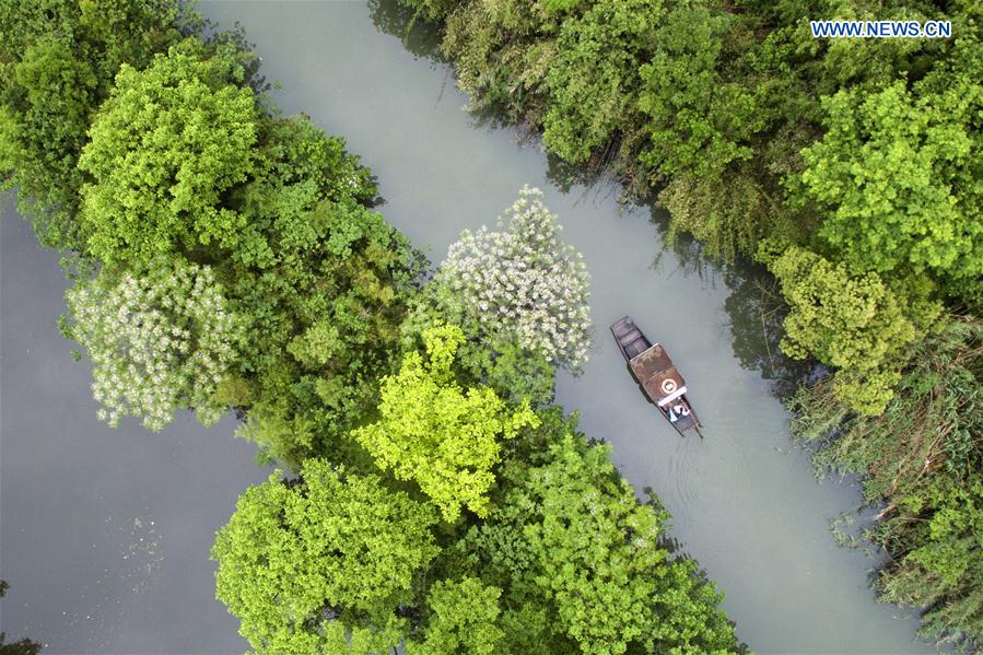 Esta foto aérea del 12 de mayo de 2016 muestra el humedal del Lago Oeste en Hangzhou, capital de la provincia de Zhejiang. China acogerá la Cumbre del G20 de 2016 en Hangzhou, una ciudad turística mejor conocida por su pintoresco Lago Oeste, el 4 y 5 de septiembre. [Foto: Xinhua]