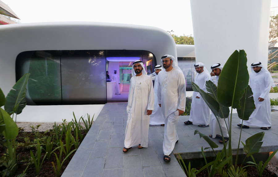 El Jeque Mohammed bin Rashid Al Maktoum (izquierda), vicepresidente y primer ministro de Emiratos árabes Unidos y gobernador de Dubai, llega a la inauguración de la primera oficina funcional construida con impresión 3D del mundo en Dubai, el 23 de mayo de 2016.