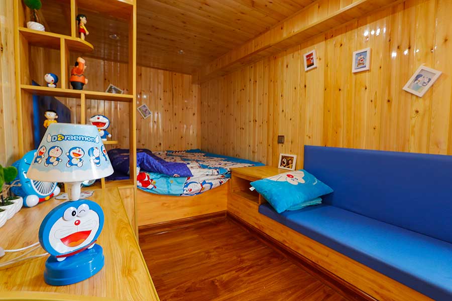 Una habitación llena de Doraemon, un personaje famoso de dibujos animados. Las casas de huéspedes están decoradas en diferentes estilos y equipadas con cocina, televisor, aire acondicionado, ducha, aseo y otros servicios, todo ello respetando la forma del autobús.
