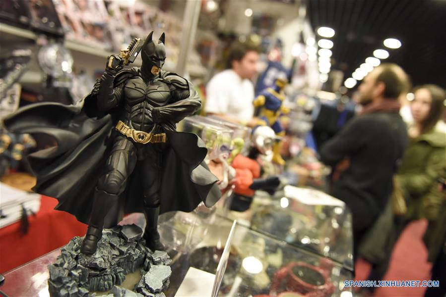 Una figura de Batmán se exhibe durante la edición 2016 de "Montevideo Comics", en el auditorio Nacional del Sodre, en Montevideo, capital de Uruguay, el 29 de mayo de 2016. De acuerdo con información de la prensa local, la convención de historietas y animación, que se encuentra en su edición número 14, cuenta con conferencias con invitados internacionales, concursos de comics y de cosplay. (Xinhua/Nicolás Celaya)