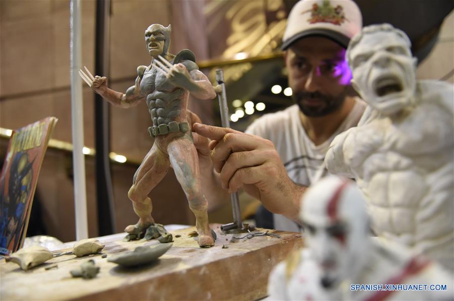 Un hombre detalla una figura exhibida durante la edición 2016 de "Montevideo Comics", en el auditorio Nacional del Sodre, en Montevideo, capital de Uruguay, el 29 de mayo de 2016. De acuerdo con información de la prensa local, la convención de historietas y animación, que se encuentra en su edición número 14, cuenta con conferencias con invitados internacionales, concursos de comics y de cosplay. (Xinhua/Nicolás Celaya)