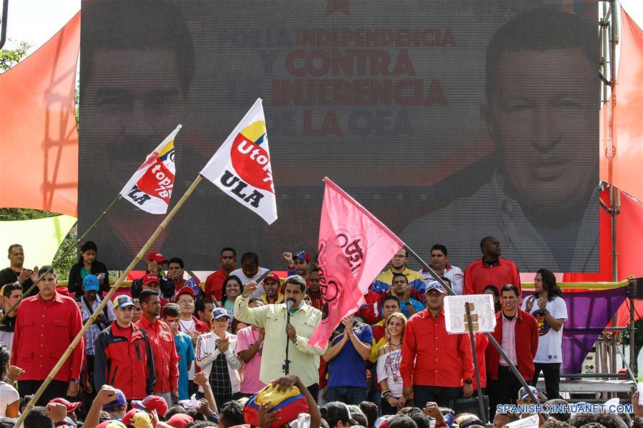 El presidente venezolano, Nicolás Maduro (c), pronuncia un discurso durante un acto con jóvenes, en Caracas, Venezuela, el 1 de junio de 2016. El presidente venezolano Nicolás Maduro instó el miércoles a la juventud y a los movimientos progresistas de todo el país a mantenerse en campa?a permanente contra la intención del "imperio (Estados Unidos de América) de intervenir" en el país caribe?o. (Xinhua/Boris Vergara)