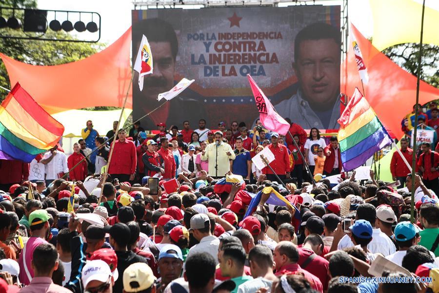 El presidente venezolano, Nicolás Maduro (c), pronuncia un discurso durante un acto con jóvenes, en Caracas, Venezuela, el 1 de junio de 2016. El presidente venezolano Nicolás Maduro instó el miércoles a la juventud y a los movimientos progresistas de todo el país a mantenerse en campa?a permanente contra la intención del "imperio (Estados Unidos de América) de intervenir" en el país caribe?o. (Xinhua/Boris Vergara)