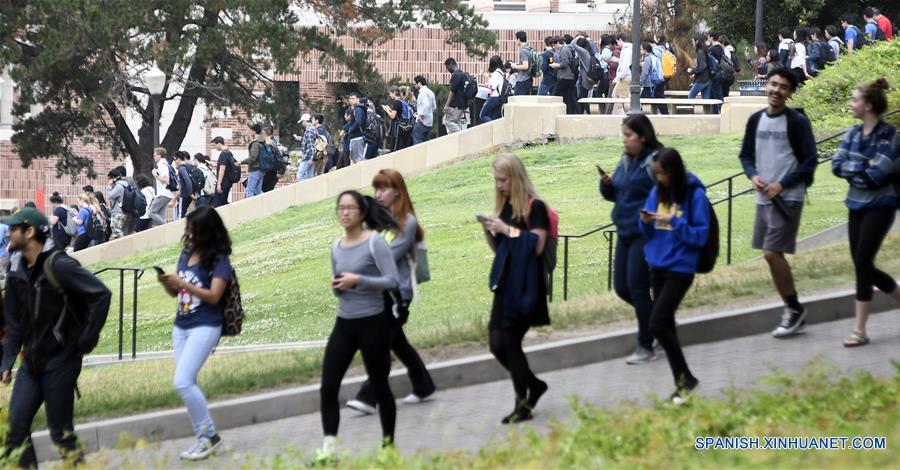 Un oficial de policía monta un vehículo en el campus de la Universidad de California Los Angeles, en Los Angeles, estado de California, Estados Unidos de América, el 1 de junio de 2016. El jefe del Departamento de Policía de Los Angeles, Charlie Beck, confirmó que el responsable del incidente ocurrido el miércoles por la ma?ana en el campus de la Universidad de California Los Angeles (UCLA) se suicidó después de matar a una persona y que el campus está seguro. (Xinhua/Yang Lei)