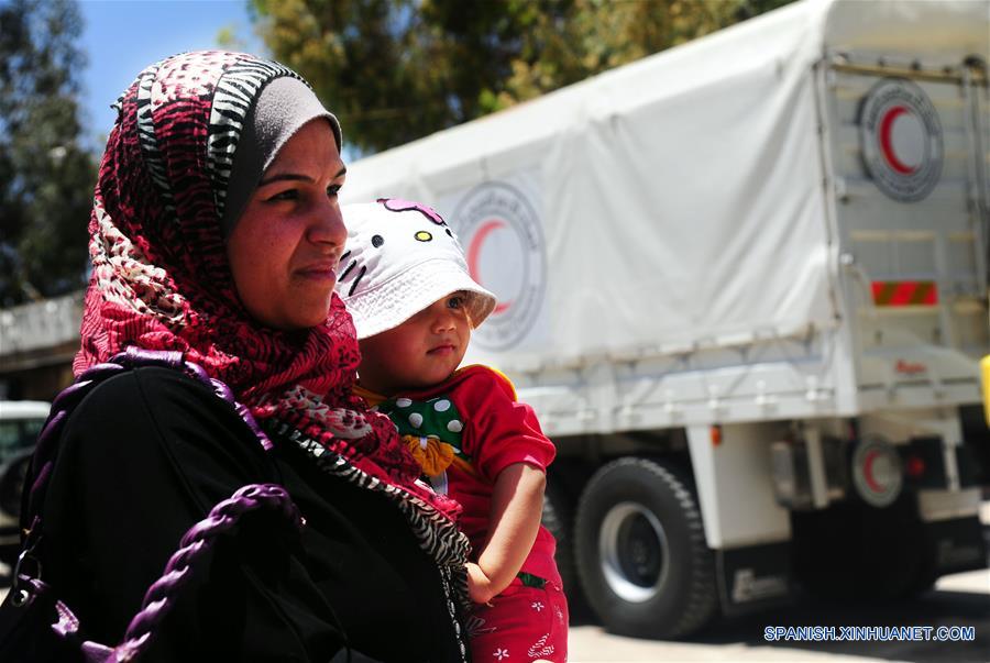 Una mujer siria y su hija esperan para recibir la ayuda de emergencia mientras un convoy de ayuda humanitaria entra a la ciudad sitiada por rebeldes de Muadamiyeh, cerca de Damasco, capital de Siria, el 1 de junio de 2016. La ayuda humanitaria llegó el miércoles a la ciudad sitiada de Daraya, cerca de la capital siria, Damasco, la primera vez que se recibe asistencia en la ciudad desde 2012, de acuerdo con el Comité Internacional de la Cruz Roja (CICR). Además de la operación en Daraya, otro convoy de ayuda entró en el poblado adjunto de Muadamiyeh. (Xinhua/Ammar)
