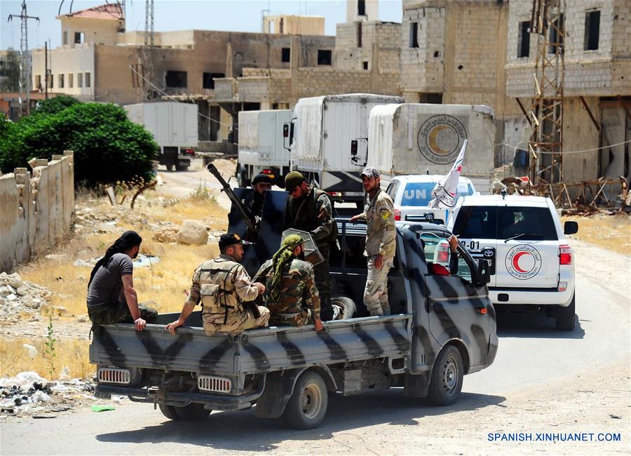 Un convoy de ayuda de emergencia entra a la ciudad sitiada por rebeldes de Daraya, cerca de Damasco, capital de Siria, el 1 de junio de 2016. La ayuda humanitaria llegó el miércoles a la ciudad sitiada de Daraya, cerca de la capital siria, Damasco, la primera vez que se recibe asistencia en la ciudad desde 2012, de acuerdo con el Comité Internacional de la Cruz Roja (CICR). Además de la operación en Daraya, otro convoy de ayuda entró en el poblado adjunto de Muadamiyeh. (Xinhua/Ammar)