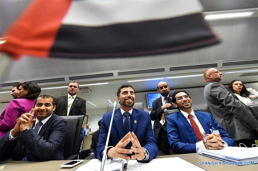 El ministro de Energía de Emiratos Arabes Unidos, Suhail Mohammed Al-Mazrouei (c), concede una entrevista previo a la 169 reunión ordinaria de la conferencia de la Organización de Países Exportadores de Petróleo (OPEP), en Viena, capital de Austria, el 2 de junio de 2016. (Xinhua/Qian Yi)