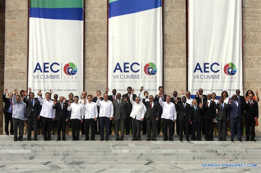 Jefes de Estado y de Gobierno posan durante la fotografía oficial de la VII Cumbre de la Asociación de Estados del Caribe (AEC), en La Habana, Cuba, el 4 de junio de 2016. Presidentes de los países miembros de la AEC ratificaron el sábado el compromiso de buscar acciones concretas comunes para afrontar el cambio climático que amenaza la existencia misma de algunas naciones del área. (Xinhua/Str)