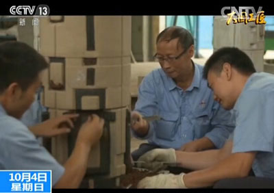 Mao Lasheng (centro) trabaja con un molde de arena con sus compa?eros. [Foto/CCTV]