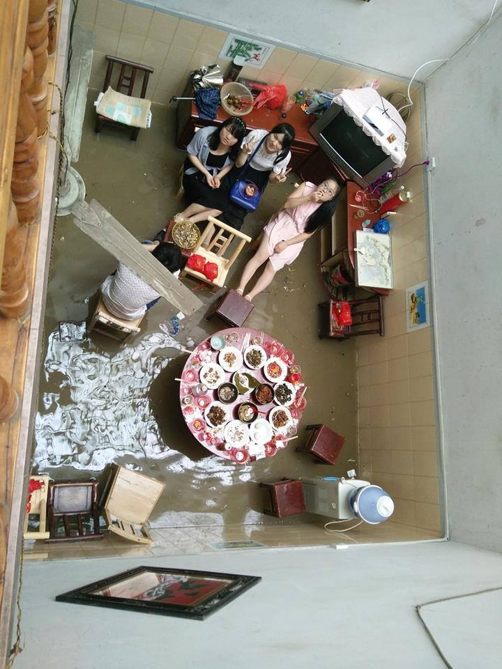Las fuertes lluvias de los últimos días han azotado en varias provincias de China, pero ni siquiera las inundaciones han logrado postergar la celebración de una boda en la provincia de Hubei. El comedor de la casa estaba lleno de agua, pero todos los invitados asistieron y disfrutaron de la celebración nupcial. [Foto: weibo.com]