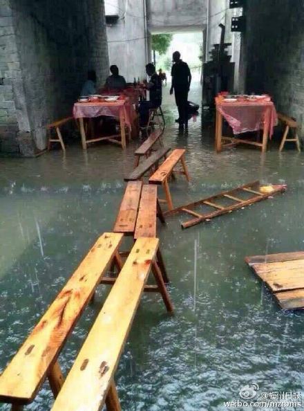 Las fuertes lluvias de los últimos días han azotado en varias provincias de China, pero ni siquiera las inundaciones han logrado postergar la celebración de una boda en la provincia de Hubei. El comedor de la casa estaba lleno de agua, pero todos los invitados asistieron y disfrutaron de la celebración nupcial. [Foto: weibo.com]