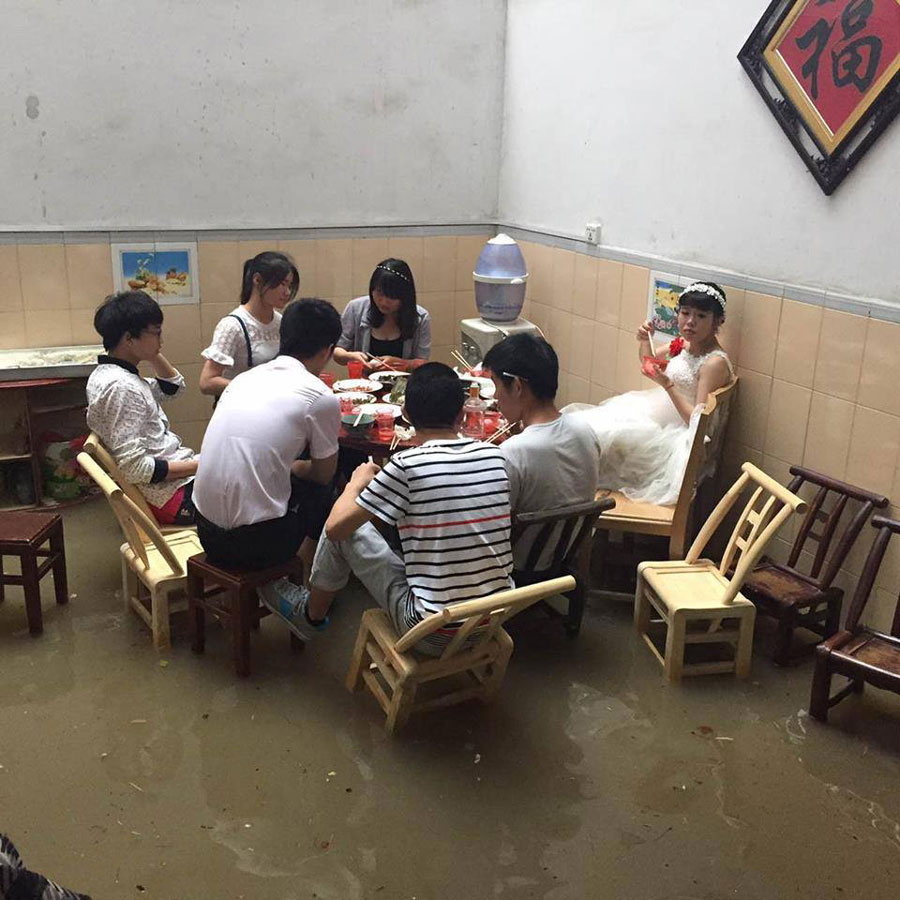 Hubei,06/06/2016 (El Pueblo en Línea) - Las fuertes lluvias de los últimos días han azotado en varias provincias de China, pero ni siquiera las inundaciones han logrado postergar la celebración de una boda en la provincia de Hubei. El comedor de la casa estaba lleno de agua, pero todos los invitados asistieron y disfrutaron de la celebración nupcial. [Foto: weibo.com]