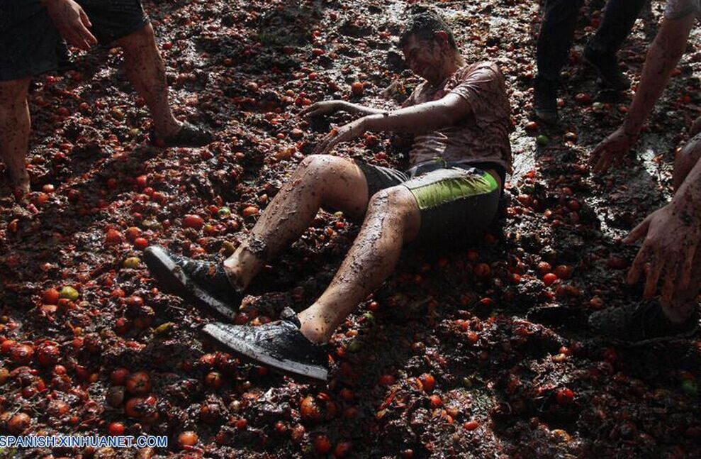 SUTAMARCHAN, junio 6, 2016 (Xinhua) -- Imagen del 5 de junio de 2016 de personas participando durante la 10 edición de la Gran Tomatina, en el municipio de Sutamarchán, departamento de Boyacá, Colombia. De acuerdo con información de la prensa local, la Gran "Tomatina", es una fiesta realizada anualmente en honor del cultivador del tomate en la población de Sutamarchán, en el departamento de Boyacá al centro del país andino. La festividad, que se realiza desde hace diez a?os, consiste en una guerra de tomates entre personas de todas las edades. (Xinhua/César Melgarejo/COLPRENSA)