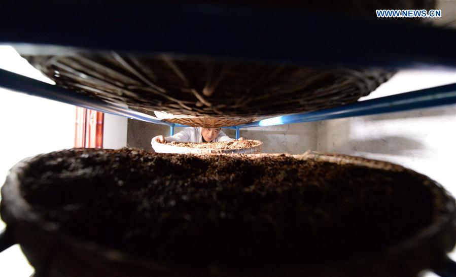 Un trabajador procesa hojas de té en Dalian, municipio Tuxi del condado Fenggang en la ciudad de Zunyi, provincia de Guizhou, el 9 de junio de 2016. El condado es hogar de 450.000 mu (30.000 hectáreas) de plantaciones de té. La industria de té se ha convertido en el pilar de la economía local. (Xinhua/Luo Xinghan)