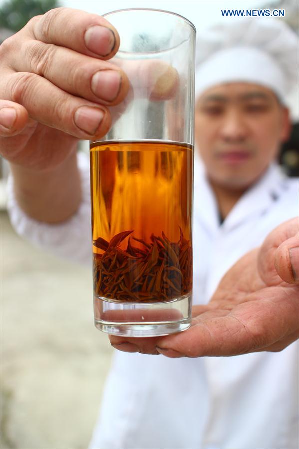 El trabajador Luo Minggang muestra un vaso de té negro en Dalian, municipio Tuxi del condado Fenggang en la ciudad de Zunyi, provincia de Guizhou, el 9 de junio de 2016. El condado es hogar de 450.000 mu (30.000 hectáreas) de plantaciones de té. La industria de té se ha convertido en el pilar de la economía local. (Xinhua/Luo Xinghan)