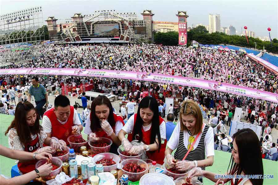JIANGSU, junio 13, 2016 (Xinhua) -- Personas comen cangrejos de río durante una semana de la comida en el condado Xuyi de Huai'an, en la provincia de Jiangsu, en el este de China, el 13 de junio de 2016.Cerca de 30,000 personas acudieron el lunes a la semana de la comida de langostas de río. Aproximadamente 30 toneladas de langostasde río fueron vendidas durante el evento. (Xinhua/Li Xiang)