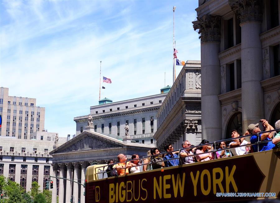 Banderas nacionales estadounidenses ondean a media asta en La Suprema Corte de Nueva York en memoria de las víctimas del tiroteo masivo en el centro nocturno gay "Pulse" en Nueva York, Estados Unidos de América, el 13 de junio de 2016. (Xinhua/Qin Lang)
