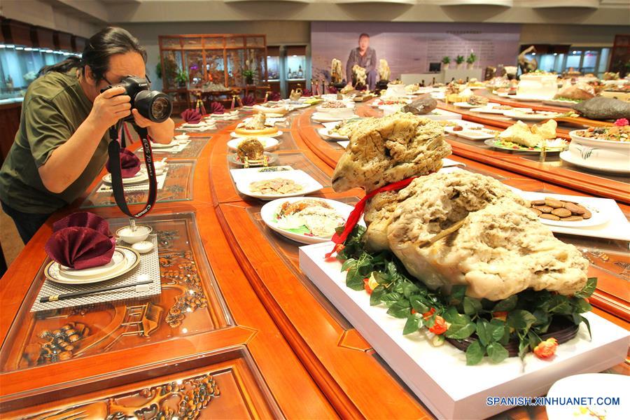 HAMI, junio 14, 2016 (Xinhua) -- Un visitante toma fotografías de piedras con forma de platillos expuestas en bandejas, en el museo de piedras raras local, en Hami, en la Región Autónoma Uygur de Xinjiang, en el noroeste de China, el 14 de junio de 2016. En total, 1,088 "platillos" hechos de pidras raras, como madera silicificada, ágata y piedra de sandre, fueron exhibidos en el museo el martes. (Xinhua/Polat)